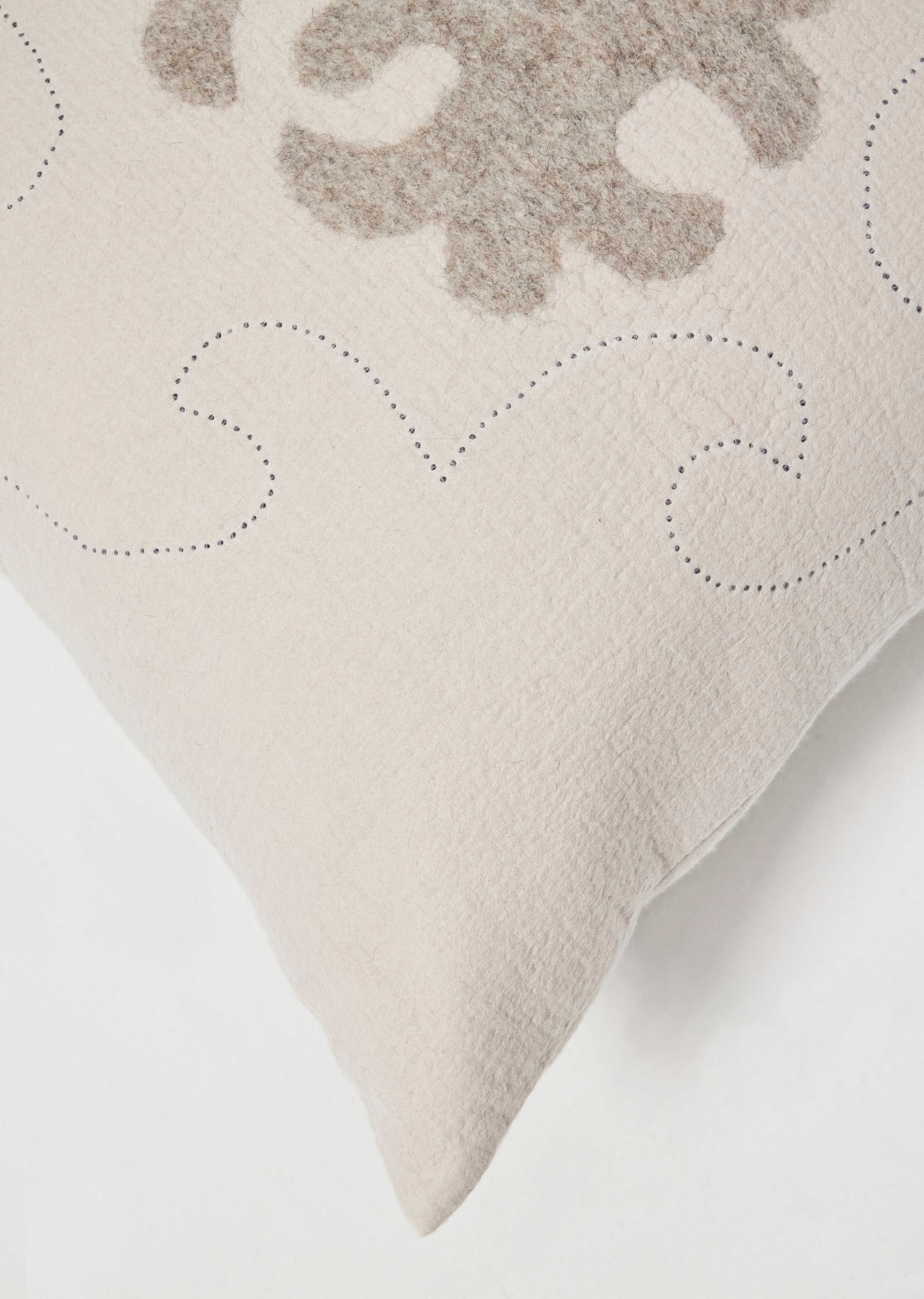 This cushion is handmade using the finest quality wool and muslin fabric. Through the process of applying heat, moisture and pressure, known as nuno-felting, our artisans form intricate patterns, which are then permanently embedded in the felt. Lightweight, soft and delicate, this cushion will add a touch of color and elevate your space.