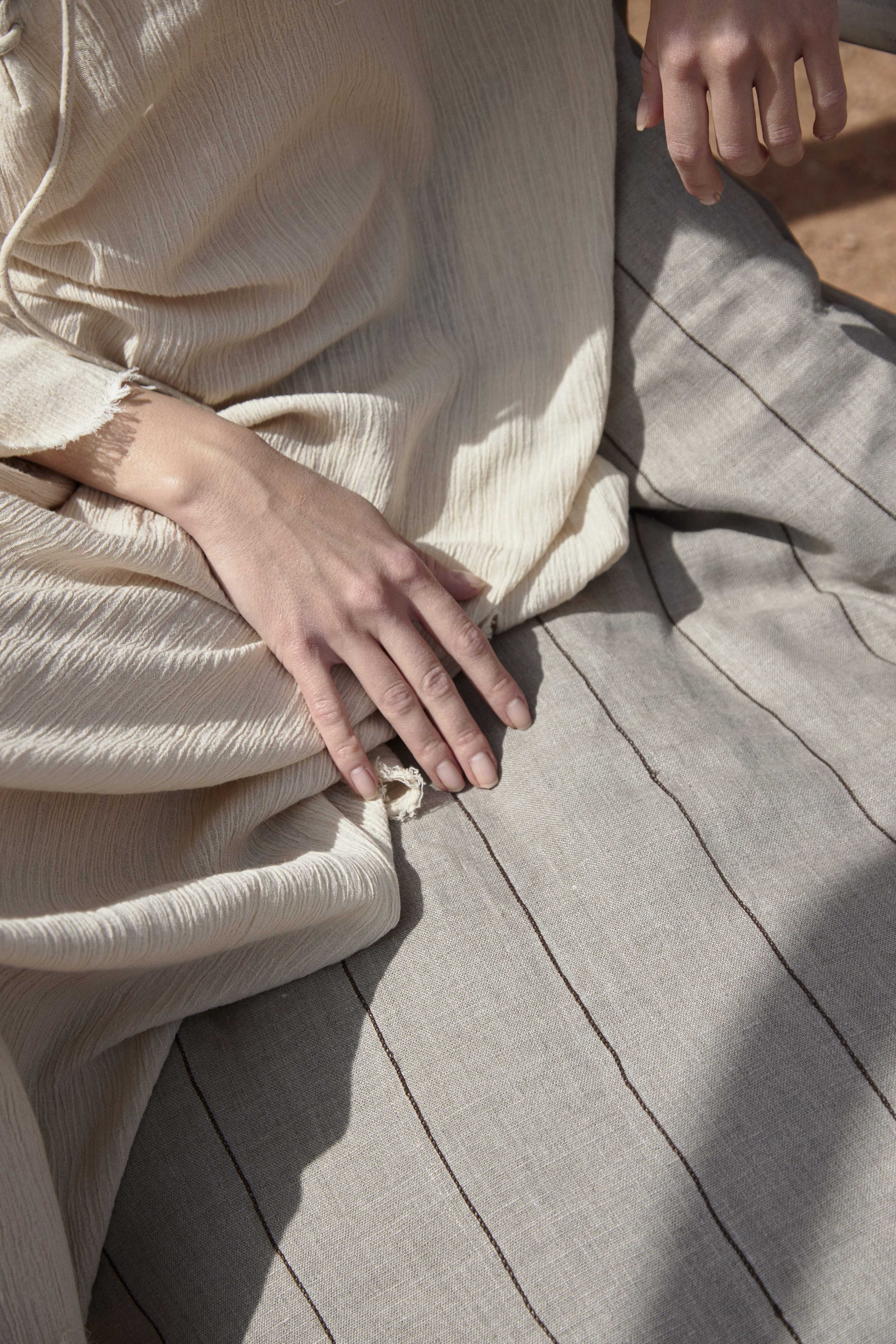 With a design philosophy rooted in simplicity, this collection is inspired by the tranquil spirit of nomadic life. Each piece in this collection resonates with the essence of peaceful landscapes and unhurried journeys. Intricate hand stitching and embroidery bring an artisanal touch to modern minimalism.