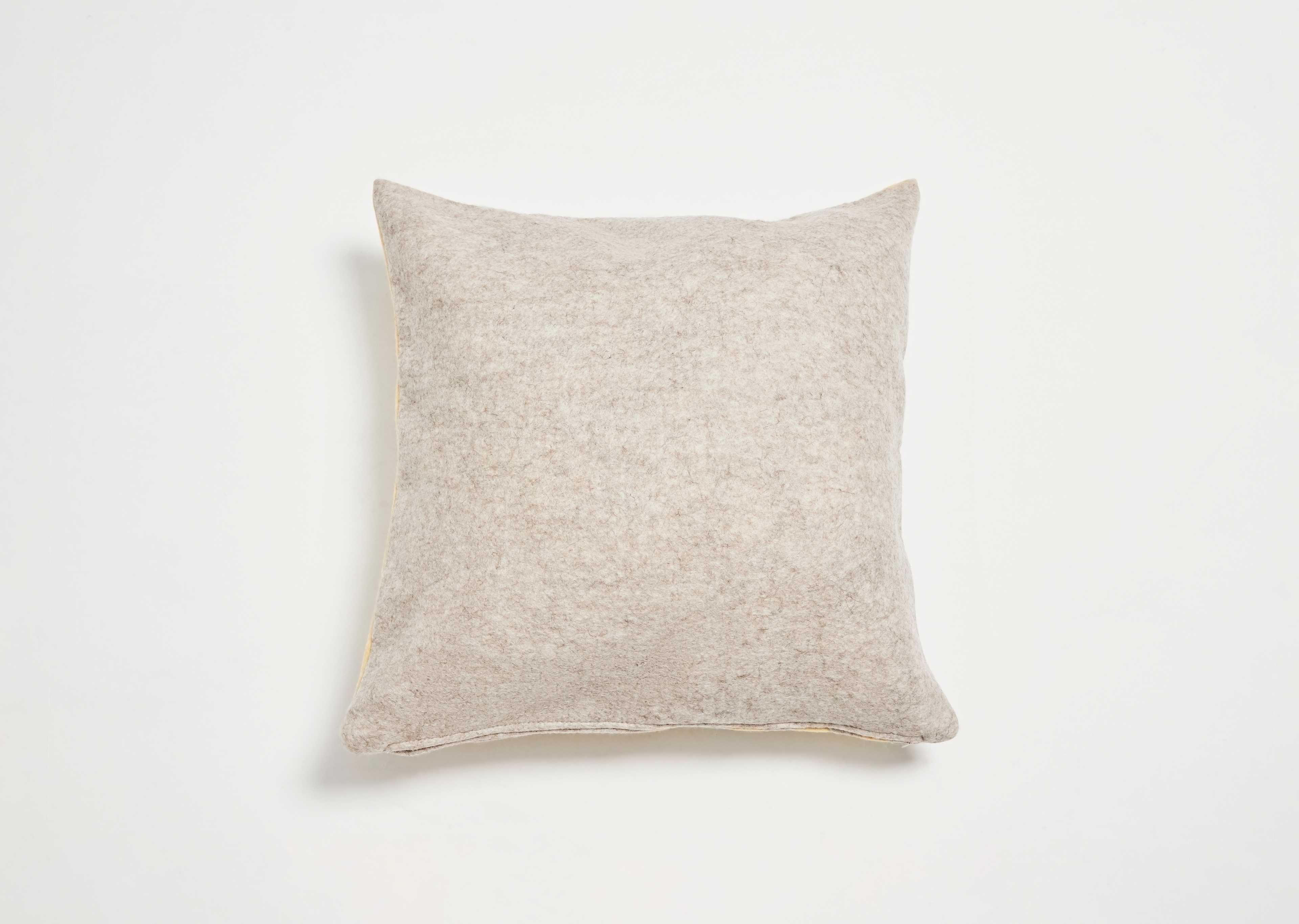 This cushion is handmade using the finest quality wool and muslin fabric. Through the process of applying heat, moisture and pressure, known as nuno-felting, our artisans form intricate patterns, which are then permanently embedded in the felt. Lightweight, soft and delicate, this cushion will add a touch of color and elevate your space.